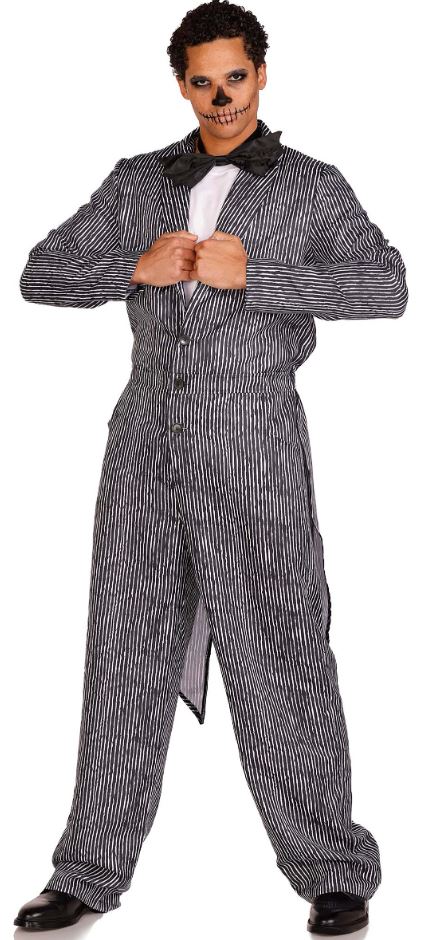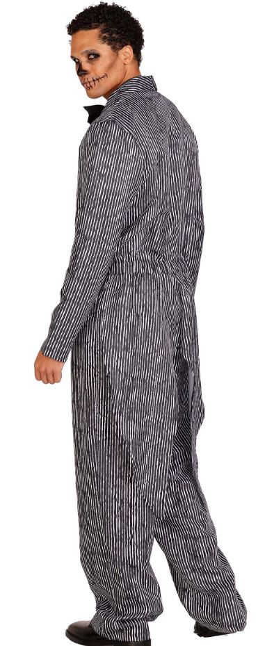 Pinstriped Tux Costume includes a tuxedo style jumpsuit with black and white pinstripes on the front and back.