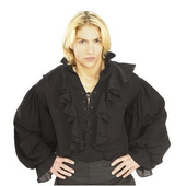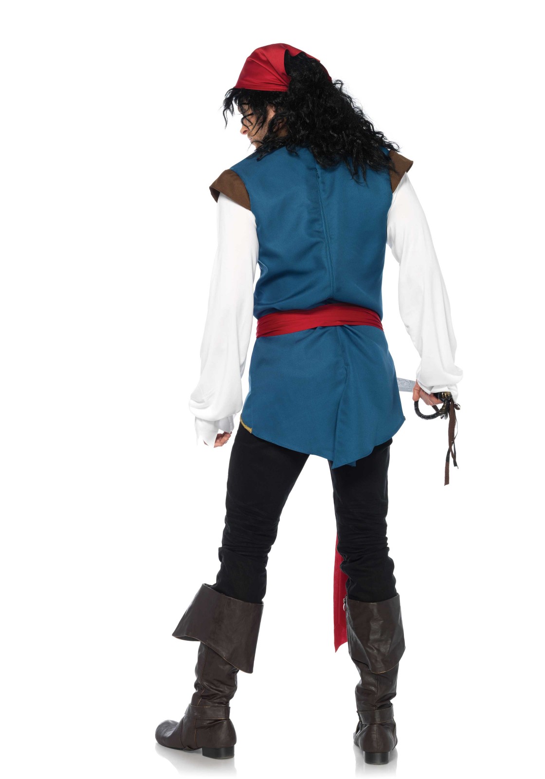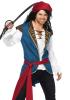 Pirate Scoundrel costume includes a gold trimmed lace up shirt/waistcoat combo and a red waist sash. To complete the pirate look a matching head scarf is also included.