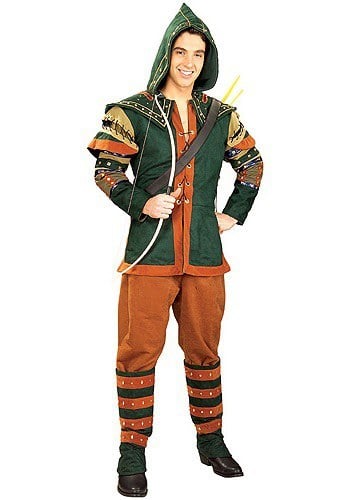 The Prince of Thieves theater quality Costume includes a hooded tunic, pants, boot tops, and quiver. Presented in plastic zip up cover for storage.