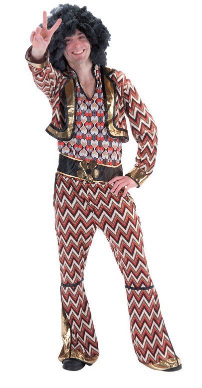 Psychedelic Hippie costume includes a brightly coloured printed top and jacket. Also included is a pair of flared trousers.