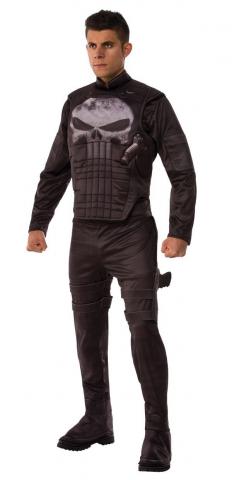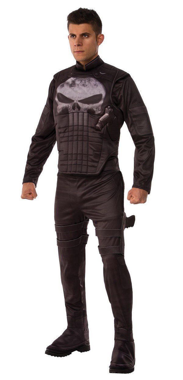 Deluxe Punisher Costume includes a black 3D top and a pair of boot tops. Costume also includes a pair of leg straps with a printed gun.