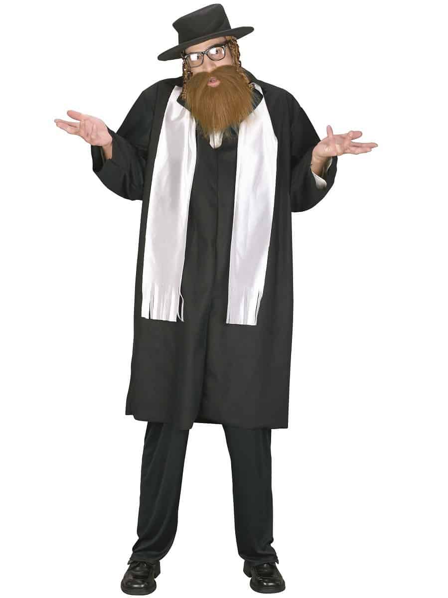 Rabbi costume includes a black pullover coat, a white talis and a hat with attached payis. Costume also includes a beard to complete the look