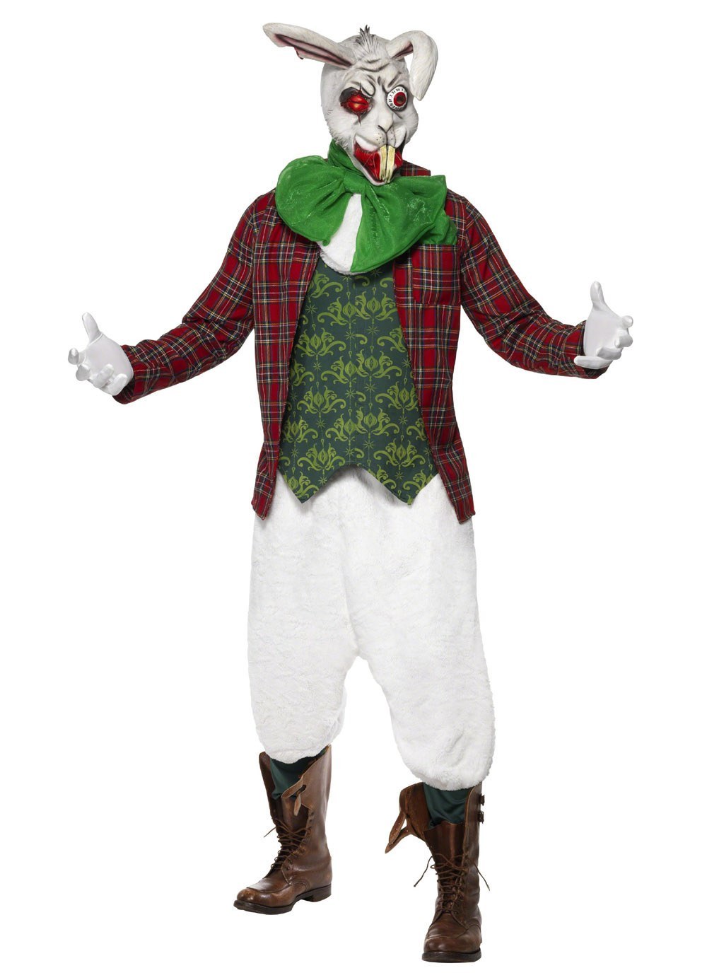 Our creepy Rabid Rabbit costume includes a maroon checkered jacket with attached green waistcoat with print design and a pair of white three quarter length velour trousers. Also included in the costume is a cravat with a large green bow tie. To complete this wicked look an evil Rabid Rabbit mask with big eyes, pointed buck teeth and attached long ears is also included.