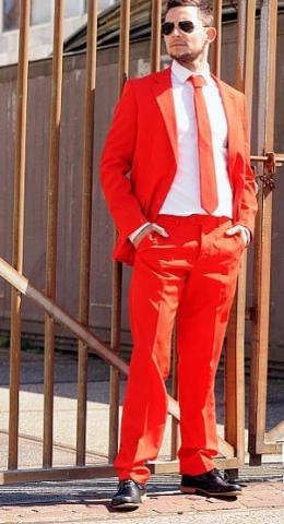 Red Devil Men's OppoSuit. Be devilishly handsome in this excellent Red Devil Opposuit. The suit will have you looking ultra smart with a red jacket and matching red trousers. The look also features a skinny red neck tie.