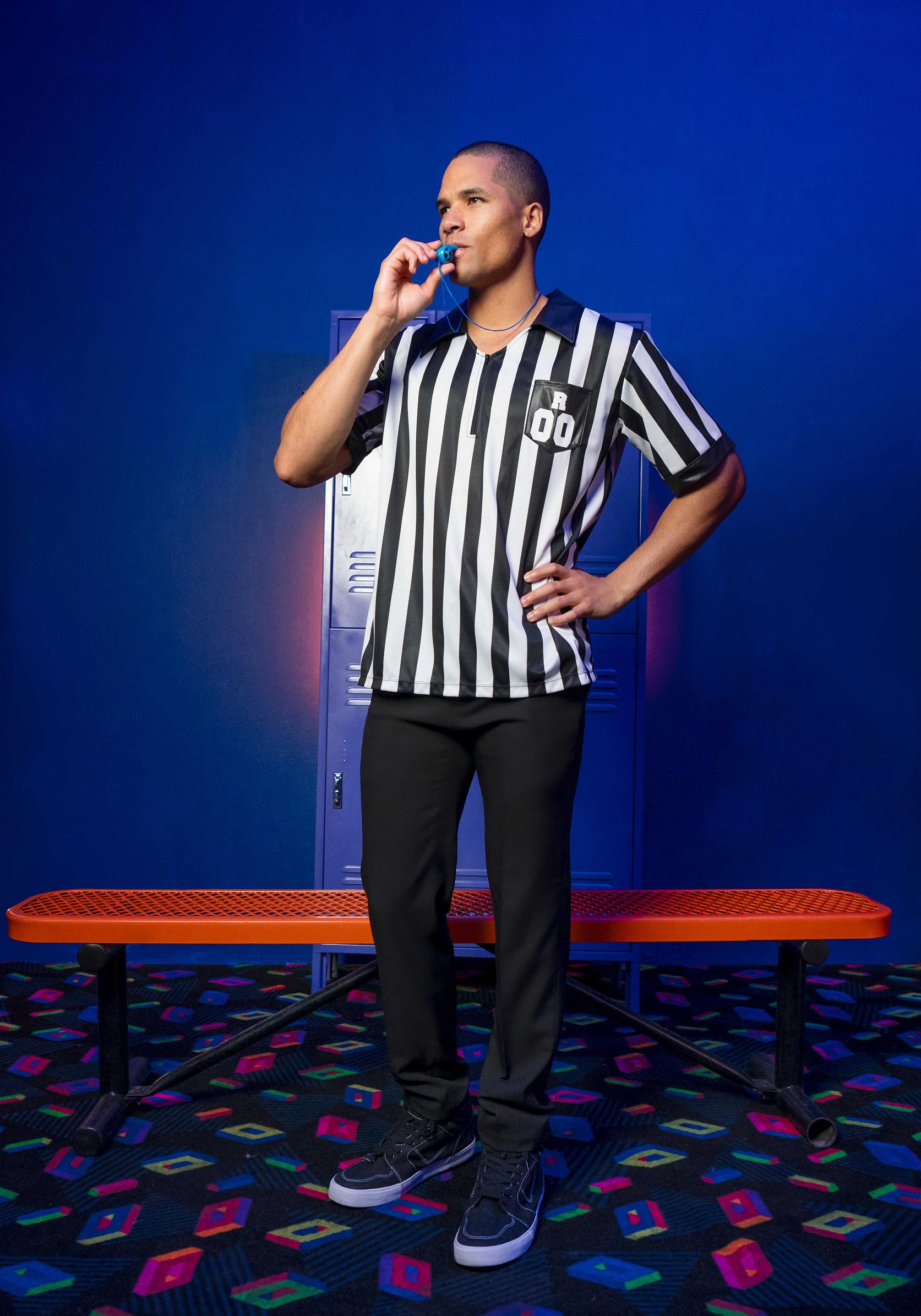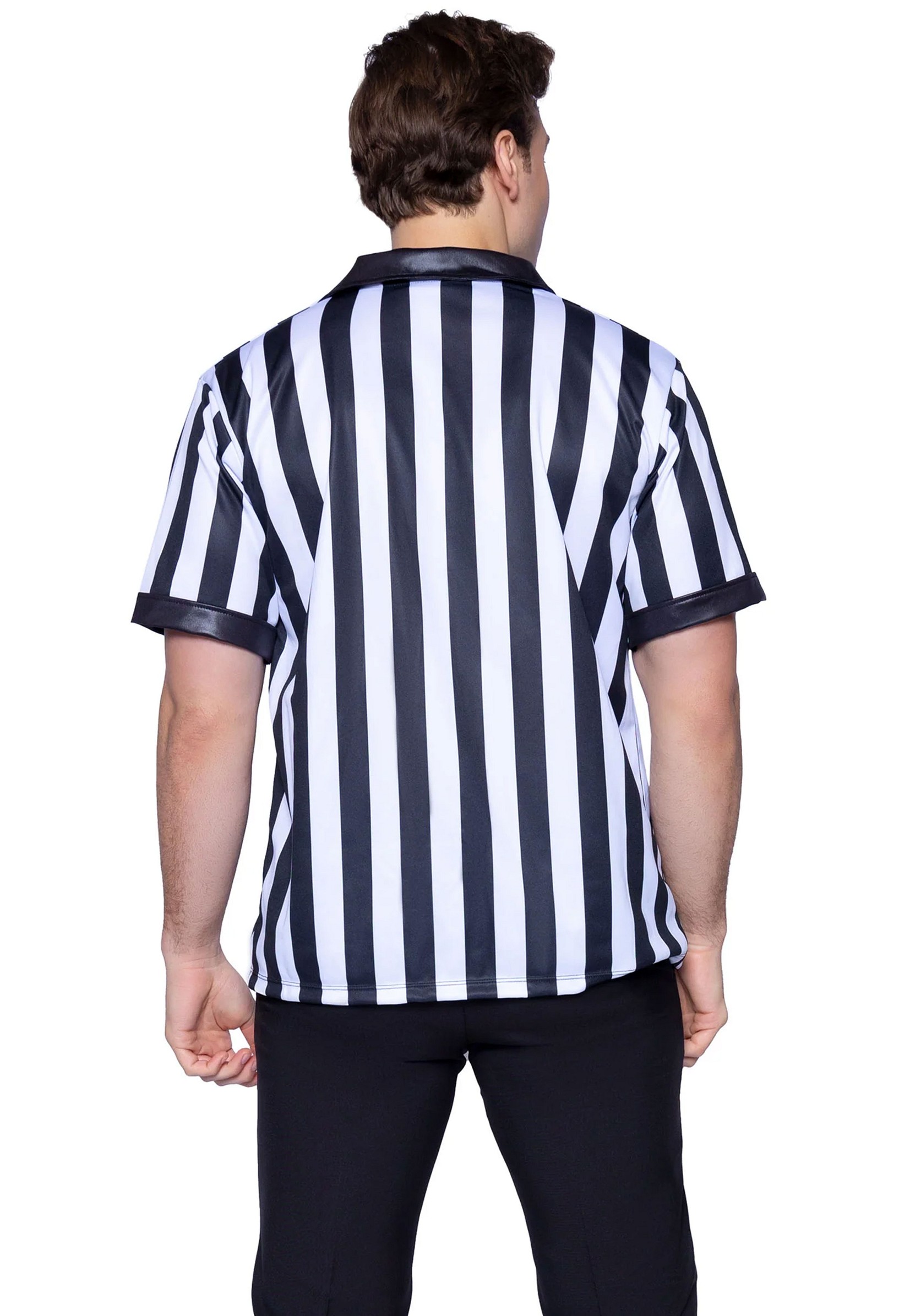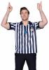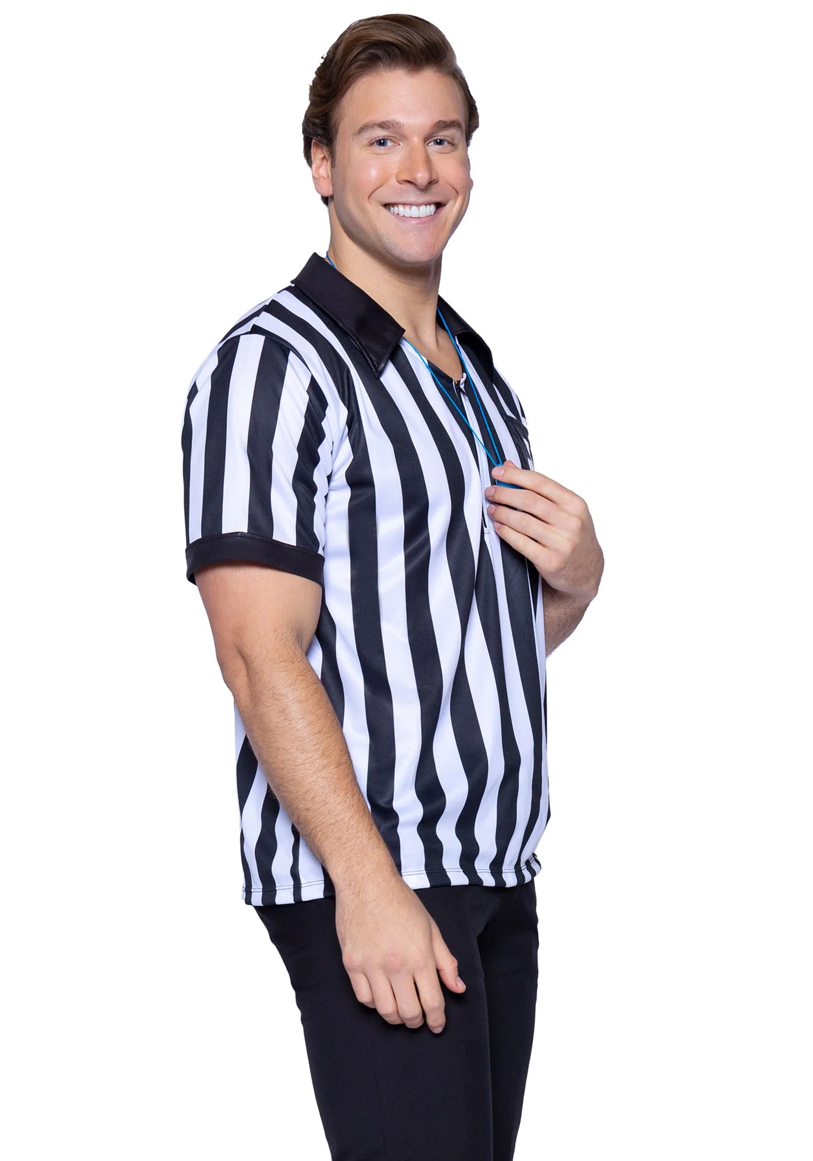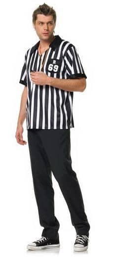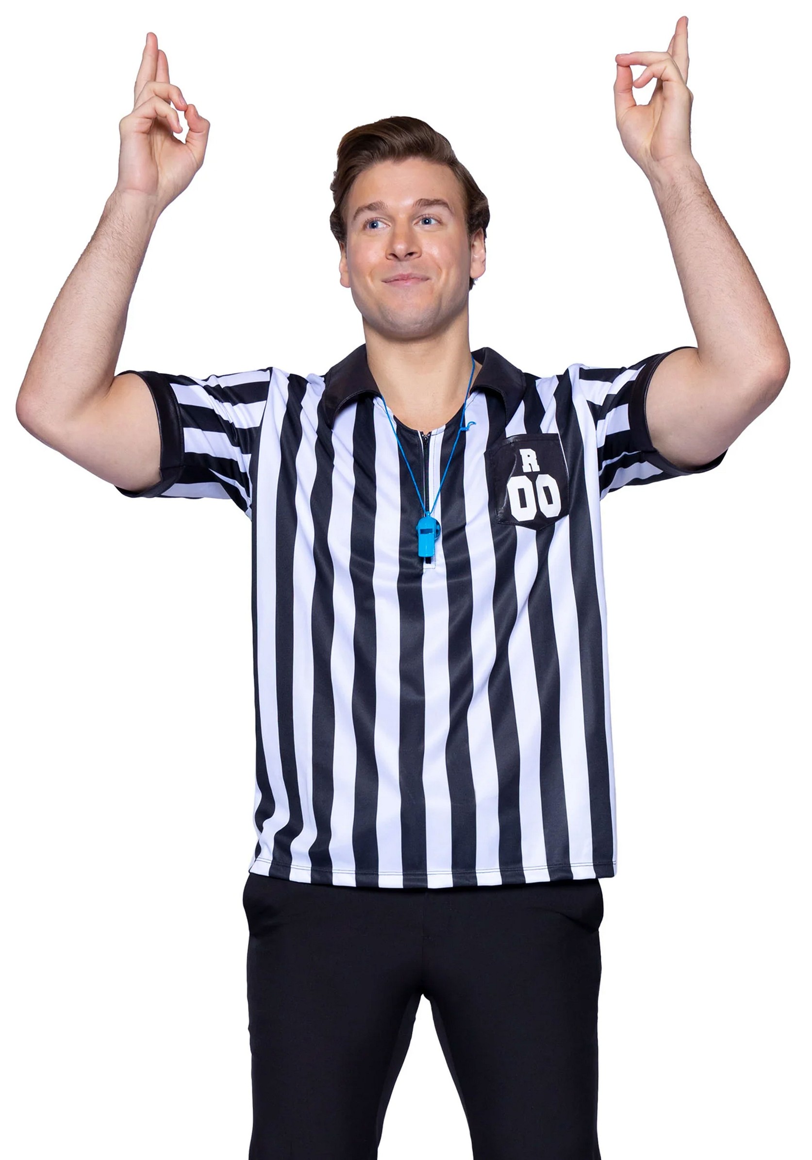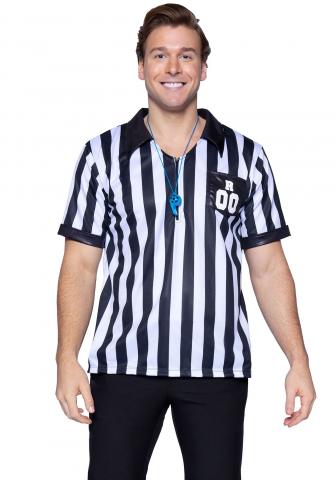 Referee Costume is a black and white stripped jersey with a short zip to close or open top half of jersey and a pocket on the left side with the number "69" on it. Also includes blue football inspired whistle on string to help you round up the team on a night out.