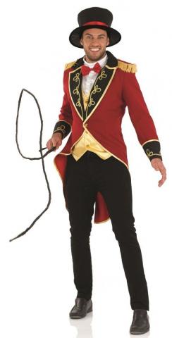 Mens Ringmaster costume includes a red jacket with gold trim and blac collar a white shirt insert. The jacket also includes black cuffs with gold detailing and an attached gold waistcoat. To complete the look a red bow tie and black hat with trim ribbon are also included.