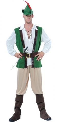 Mens Robin Hood costume includes a white long sleeved top with lace up front and an attached green velour waistcoat with black trim. Also included is a pair of beige trousers and a brown belt with gold buckle.