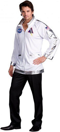This costume consists of white print jacket with silver stripe down the arms and trim on the bottom of the jacket and on the collar. The right arm has a US flag, and there is a "Blast" logo on the right chest area and rocket image on the left chest area.