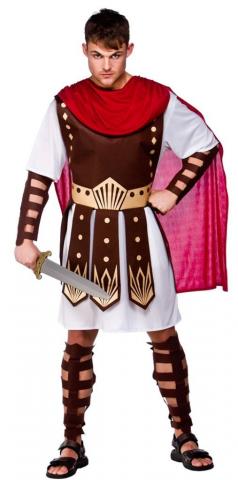 Mens Roman Centurion costume includes a tunic and tabard with attached cape. Also included is a pair of leg and arm guards.