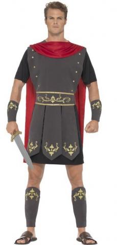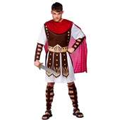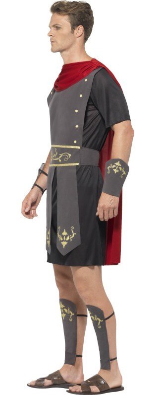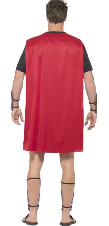 Go back in time with this Roman Gladiator costume consisting of a white tunic, black body armor with attached belt and cape featuring velcro shoulder guard.
