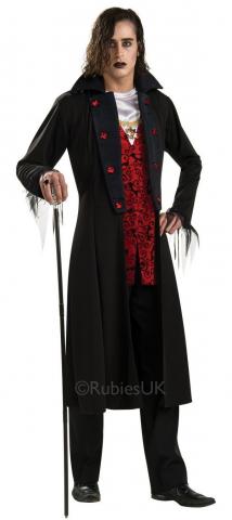 Royal Vampire Costume includes a long black coat with red button detailing and an attached waistcoat.