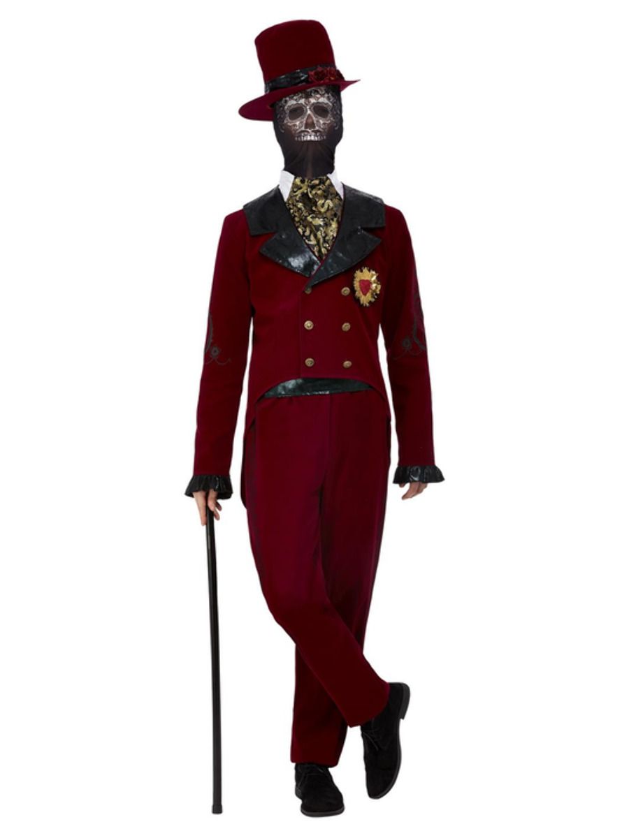 Deluxe DOTD Sacred Heart Groom Costume includes a burgundy jacket, Mock Shirt, Trousers, Mask & Hat