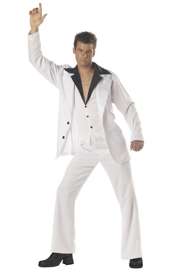 The Saturday Night Fever Costume consists of a white jacket with black buttons and a white button down vest with attached collar. The costume also comes with matching flared trousers to complete the disco look.