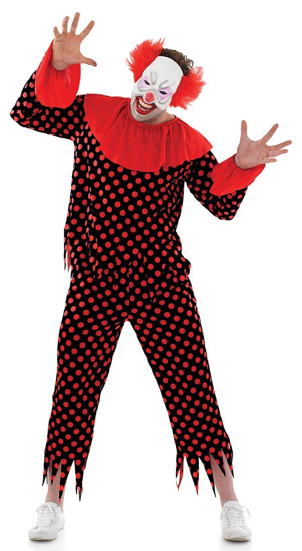 Scary Male Clown Costume includes a red and black spotted top with a red ruffle neckline and sleeves with a tattered hemline. Costume also includes a pair of matching trousers.