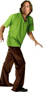 This adult Shaggy costume consists of shirt, trousers, wig and goatee beard.