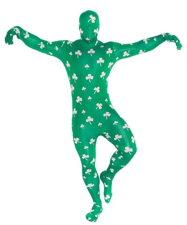 The Shamrock Morphsuit in green with white printed shamrocks makes a great fancy dress option.