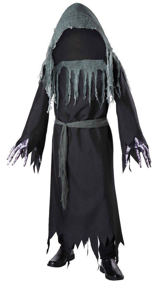 Shrouded Phantom Costume includes a long black hooded rope with frame and light to illuminate your face. Costume also includes a belt and a pair of gloves.