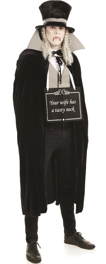 Silent Film Vampire Costume includes a waistcoat with an attached shirt and a bow-tie. Costume also includes a cape and a sign.
