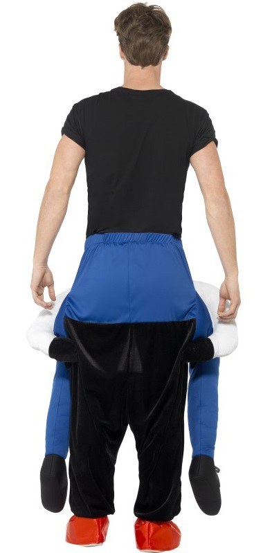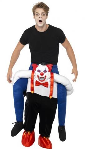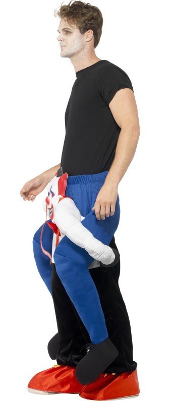 Sinister Clown Piggy Back Costume includes a one piece clown suit with mock human legs.