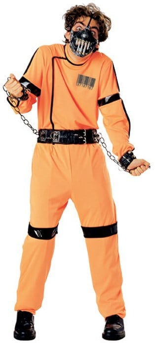 Skitzo Costume includes orange jumpsuit with printed barcode