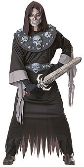 Skullzor costume consists of a long black hooded robe with jagged ends and grey trim on the sleeves. This evil costume also includes a latex belt with skull applique and a matching latex collar.