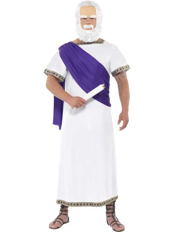 Socrates Costume includes long white toga with silver and purple detailing on the edges and attached over the shoulder sash. To complete the look of this famous philosopher a scroll is also included.