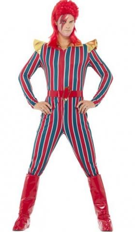 Space Superstar Costume includes a multi-coloured one piece jumpsuit with a red belt and a pair of red boot covers.