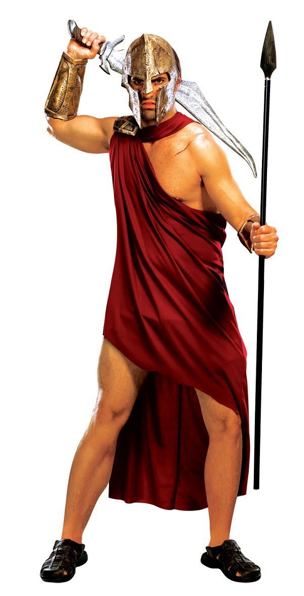 Spartan costume includes a wine toga with clasp. Also included is a pair of gauntlets and a latex half helmet.