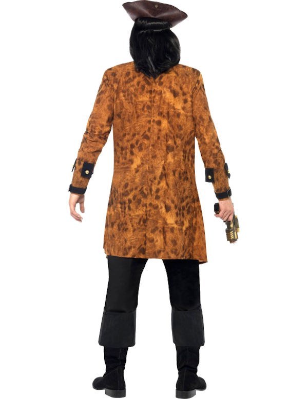The Steampunk Pirate Costume includes a brown and black mottled look jacket with gold studs and black buckles around the wrists and a black faux waistcoat printed with green and orange cog detail and a gold braided trim.