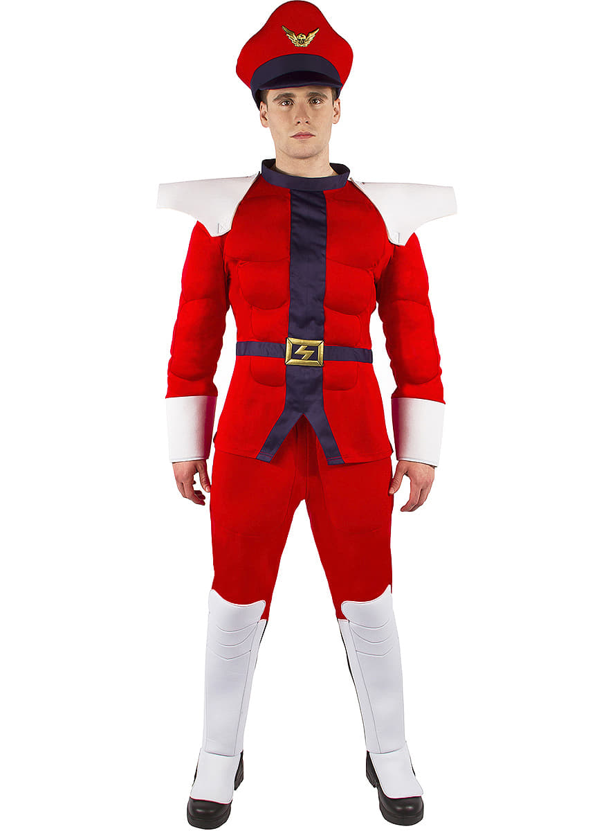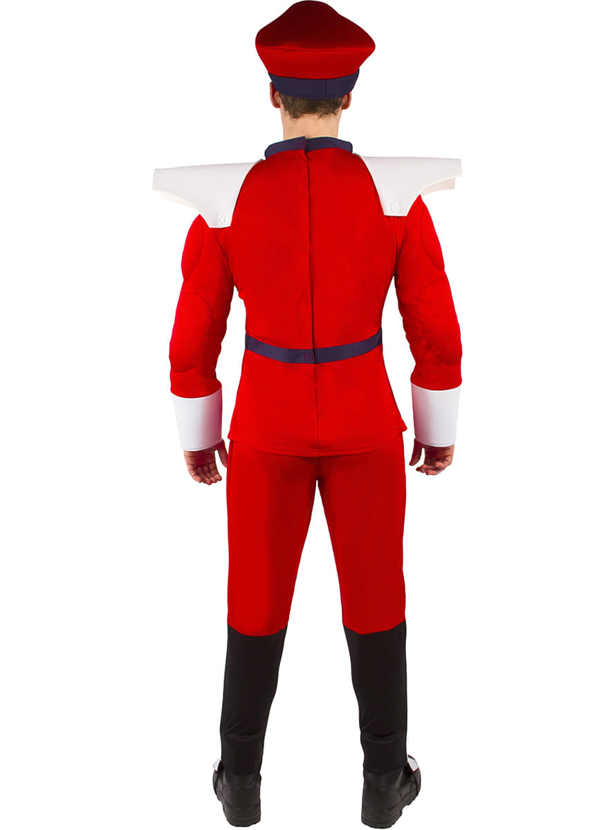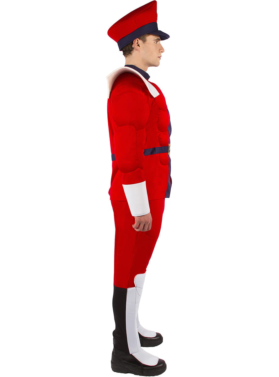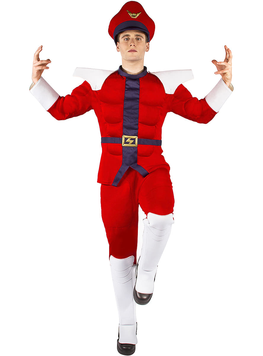 Street Fighter Mr Bison Costume includes T-Shirt with muscly chest and arms, shoulder pads, trousers, hat and boot covers.