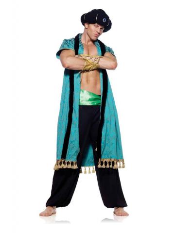 Sultan Costume consists of a high quality long turquoise robe with black faux fur trim and gold tassel trim along the end. Also includes soft padded black hat with gold trim and blue diamonte, green and gold satin look sash and to complete look two arm cuffs with gold ribbon detail.