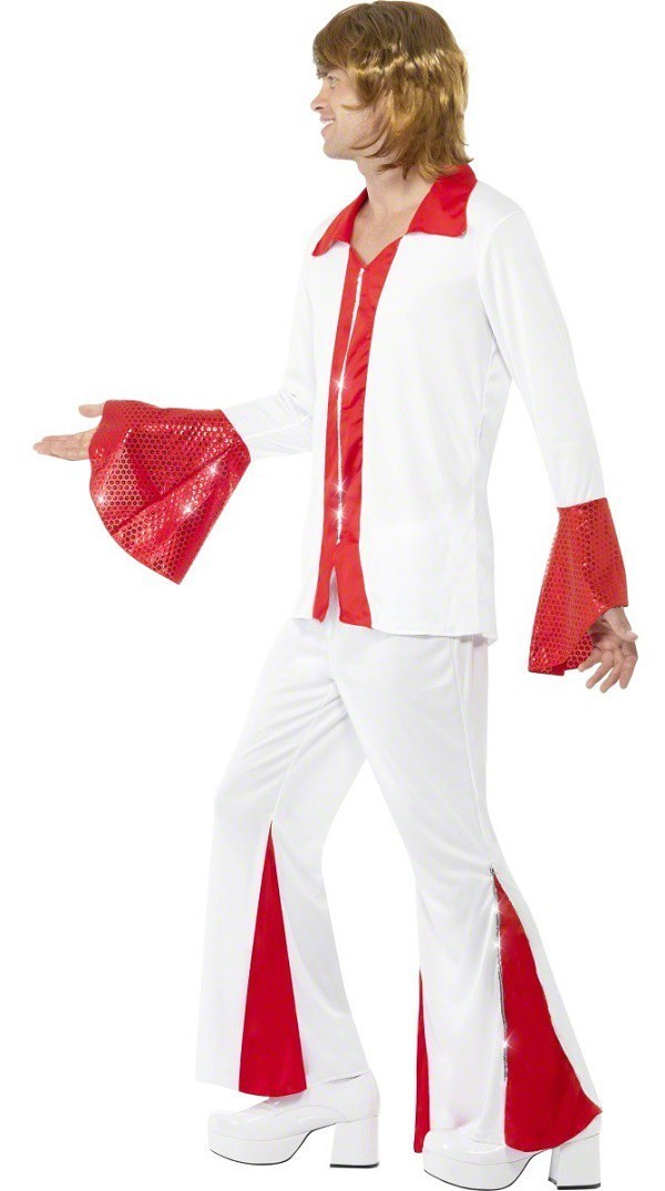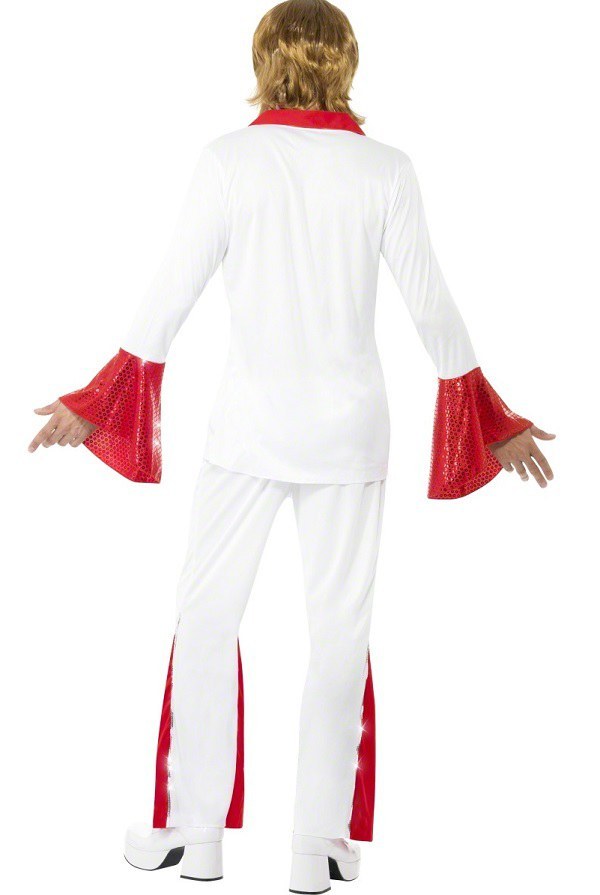 Super Trooper Male costume includes a red and white shirt with sequin detail. Costume also includes a pair of co-ordinatuiing trosuers.