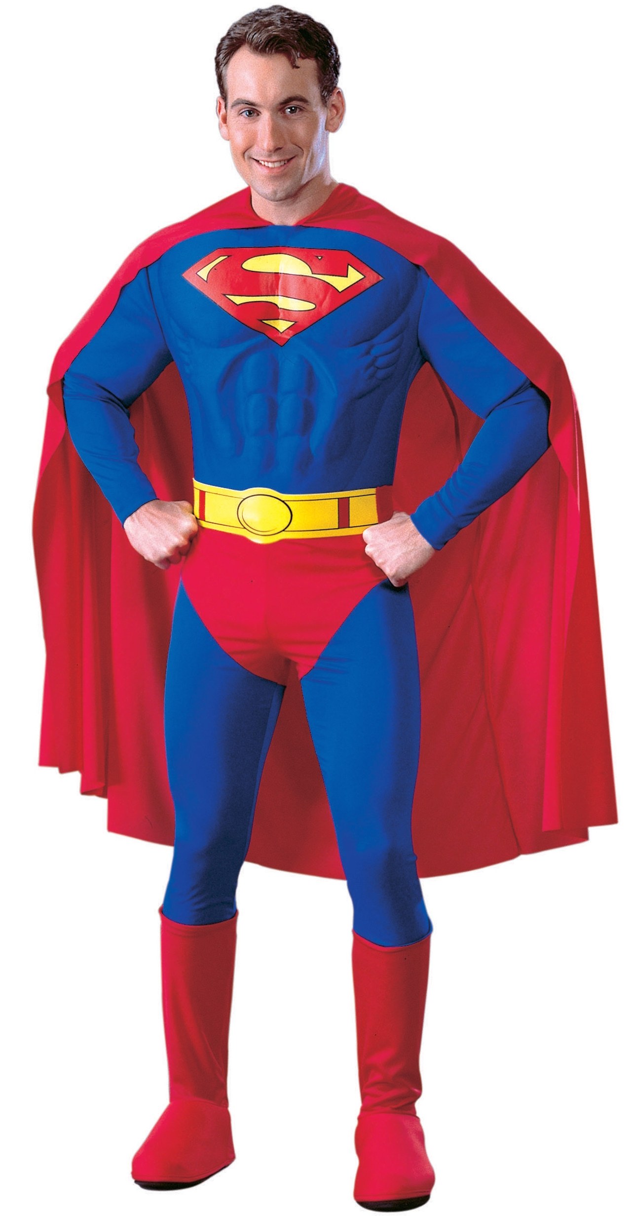 The Superman Muscle costume is a licensed replica of the outfit worn in the film Superman Returns. The costume consists of a one piece blue and red jumpsuit with a padded foam muscle effect on the torso. Printed across the chest is the classic red and yellow superman logo. The underpants and boot-tops are attached to the jumpsuit and not separate pieces, this allows the wearer to wear their own shoes while giving the look of superman boots..