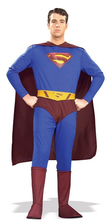 The Superman Returns costume includes a one-piece blue and burgundy jumpsuit with colour printed Superman logo on the chest and attached burgundy boot tops. To complete the costume a medium length burgundy cape that fastens around the neck using velcro is also included.