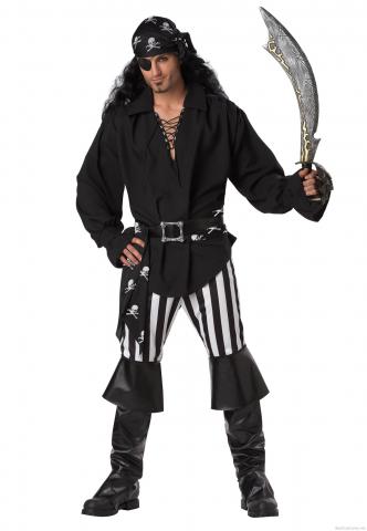 This costumes comes with a black V-neck shirt with belt and black and white striped pants with waist sash.