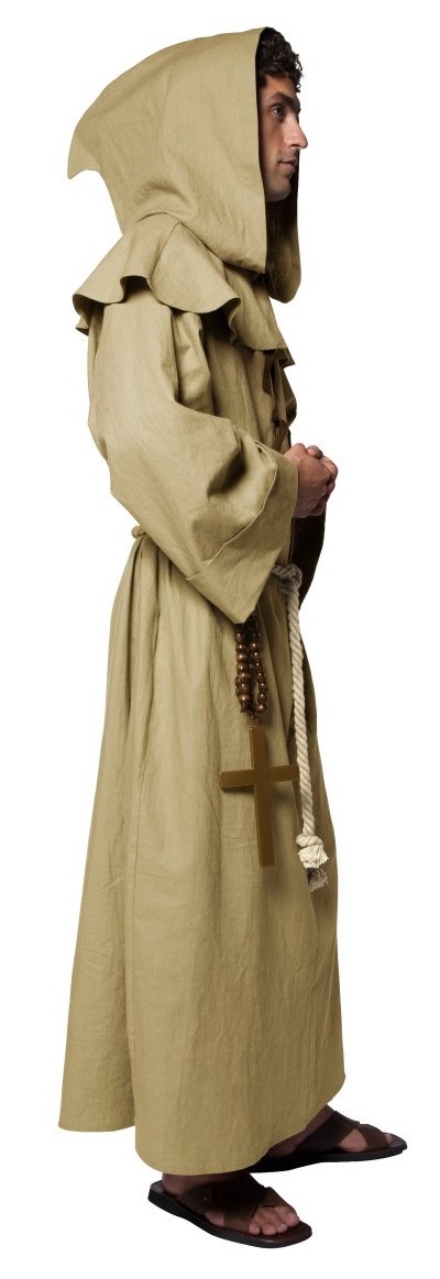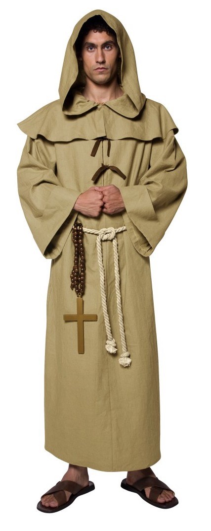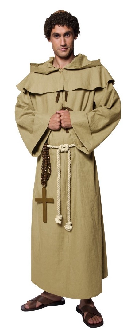 The costume comes with a light brown, full length polyester robe with a large hood, long sleeves and front closure. A brown shawl falls over the shoulders of the robe. Also included is a white rope belt to tie around the waist and a rosary cross to complete the Friar Tuck attire.