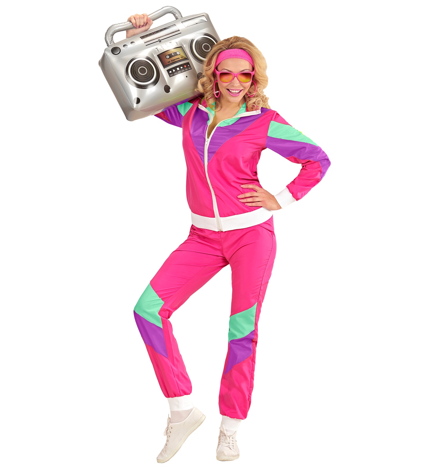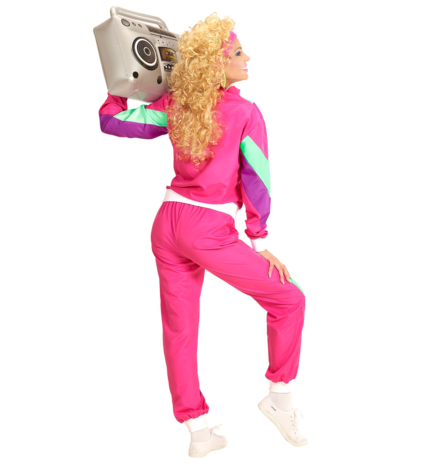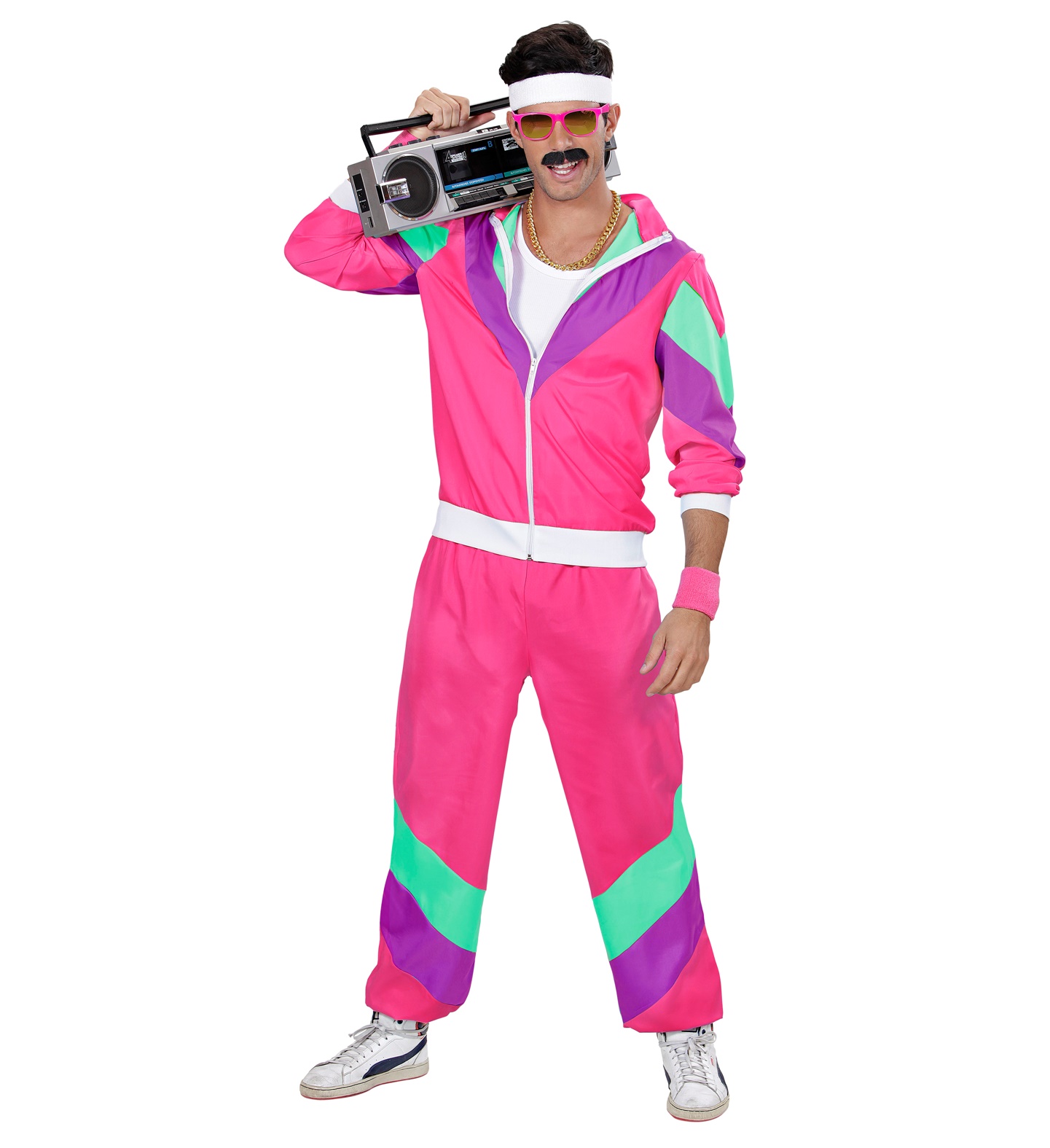 The 80's Shell suit includes a zip up tracksuit jacket and a pair of matching tracksuit bottoms. This 80's look feature trousers with an elasticated waist.