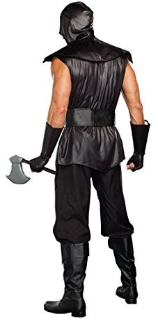 Included in this costume is a black hooded leather look tunic and a belt with loop for weapon. Costume also includes a pair of wrist gauntlets.