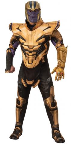 Costume includes a one piece printed padded jumpsuit with attached gauntlets and boot tops. Costume also includes a padded tabard. To complete the look an infinity gauntlet and a Thanos face mask is also included.