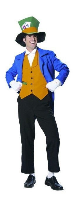 The Mad Hatter costume includes a blue tail coat jacket with a yellow faux suede mock waistcoat with black buttons and elastic band to hold around the neck and a strap to tie around your back. Also included in this bright look us a faux suede top hat with playing cards screen- print.