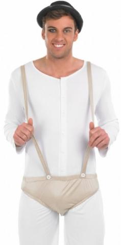 The Prisoner Costume includes a one piece white jumpsuit with attached beige pants and braces. The jumpsuit features a button up front.
