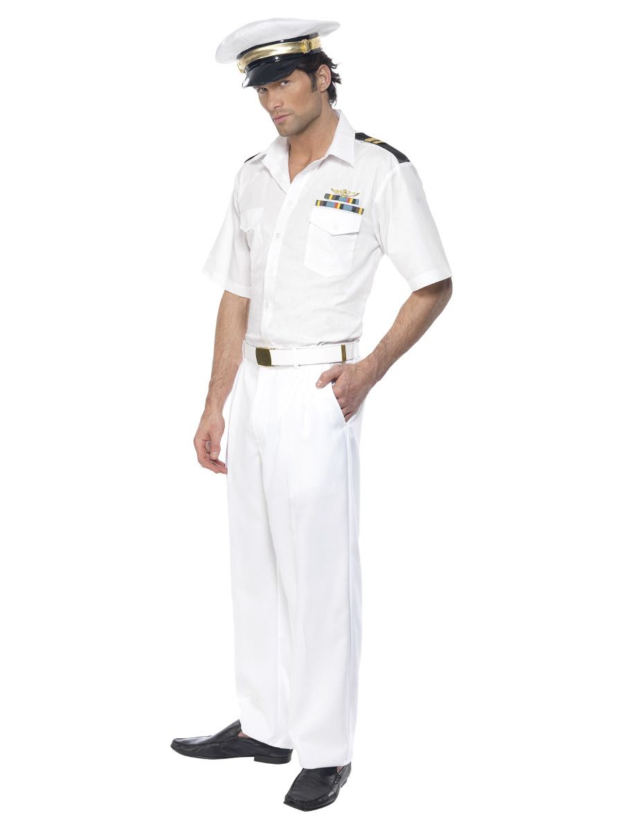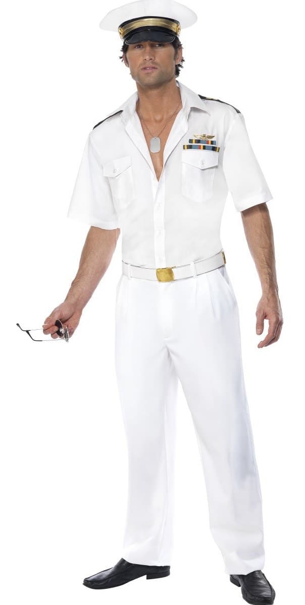 The Captain Costume from Top Gun has a white short sleeved shirt, white belt and gold buckle and white trousers.