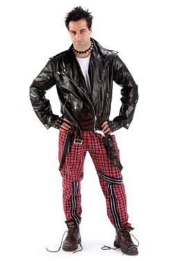 Our vicious punk costume includes a wet look black jacket with frontal zip closure and belt. Costume also includes a pair of tartan style trousers with zip and braces.