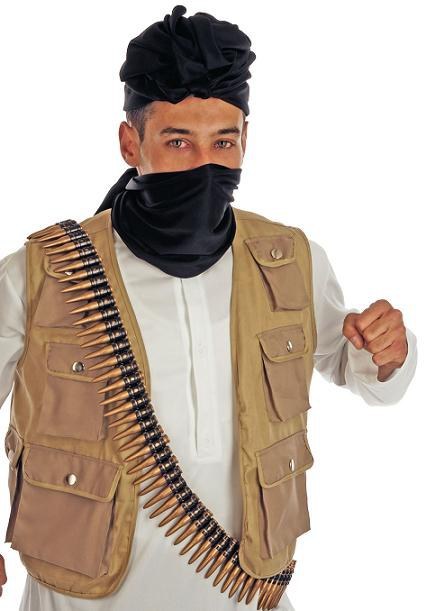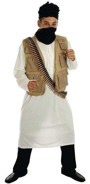 Desert Warrior costume consist of a long white tunic, mustard waistcoat with khaki coloured pockets and silver buttons, a black scarf and matching headband.