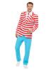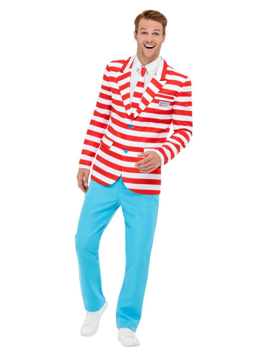 Be your favourite book character in our fabulous 'Where's Wally?' suit. Where has Wally gone? Where could he be hiding? Well, that will be up to you when you pop this on. This suit includes a red and white striped jacket, a red and white striped tie and a blue pants.