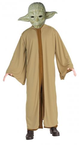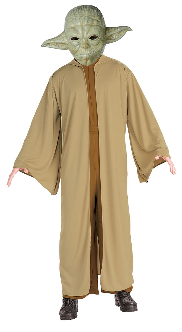 Our Star Wars Yoda Costume includes a long hooded robe and a brown jumpsuit. To complete the look a Yoda face mask is also included.