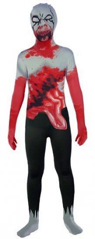 Zombie Full body stretch jumpsuit. The mask has a bloody skull design with a white and blood design on chest and arms, from the waiste down the costume is black with a torn off look at the ankles. The feet of the costume are of a white design.