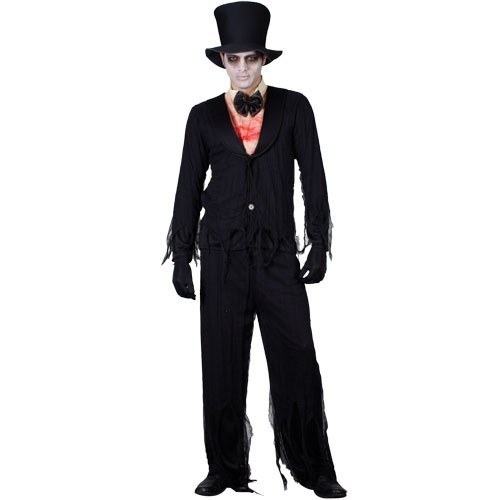 This creepy Zombie Bridegroom costume includes a black jacket with a mesh overlay and a white shirt front with blood splats and an attached bow tie. Also included is a pair of co ordinating black trousers with an elasticated waist.