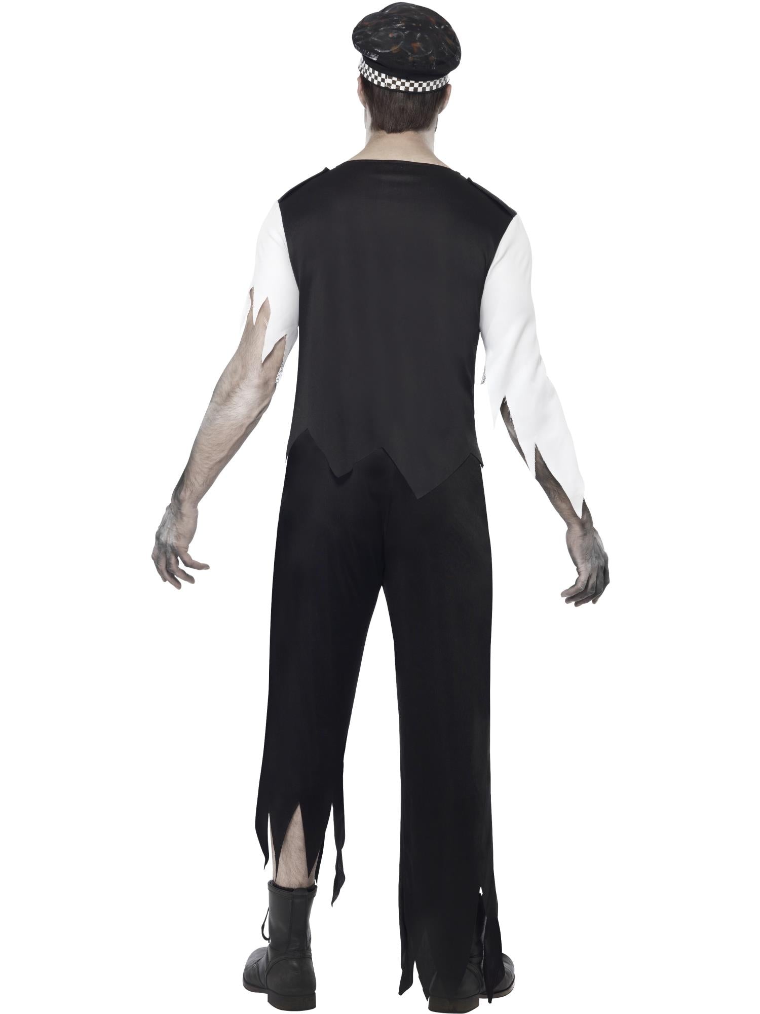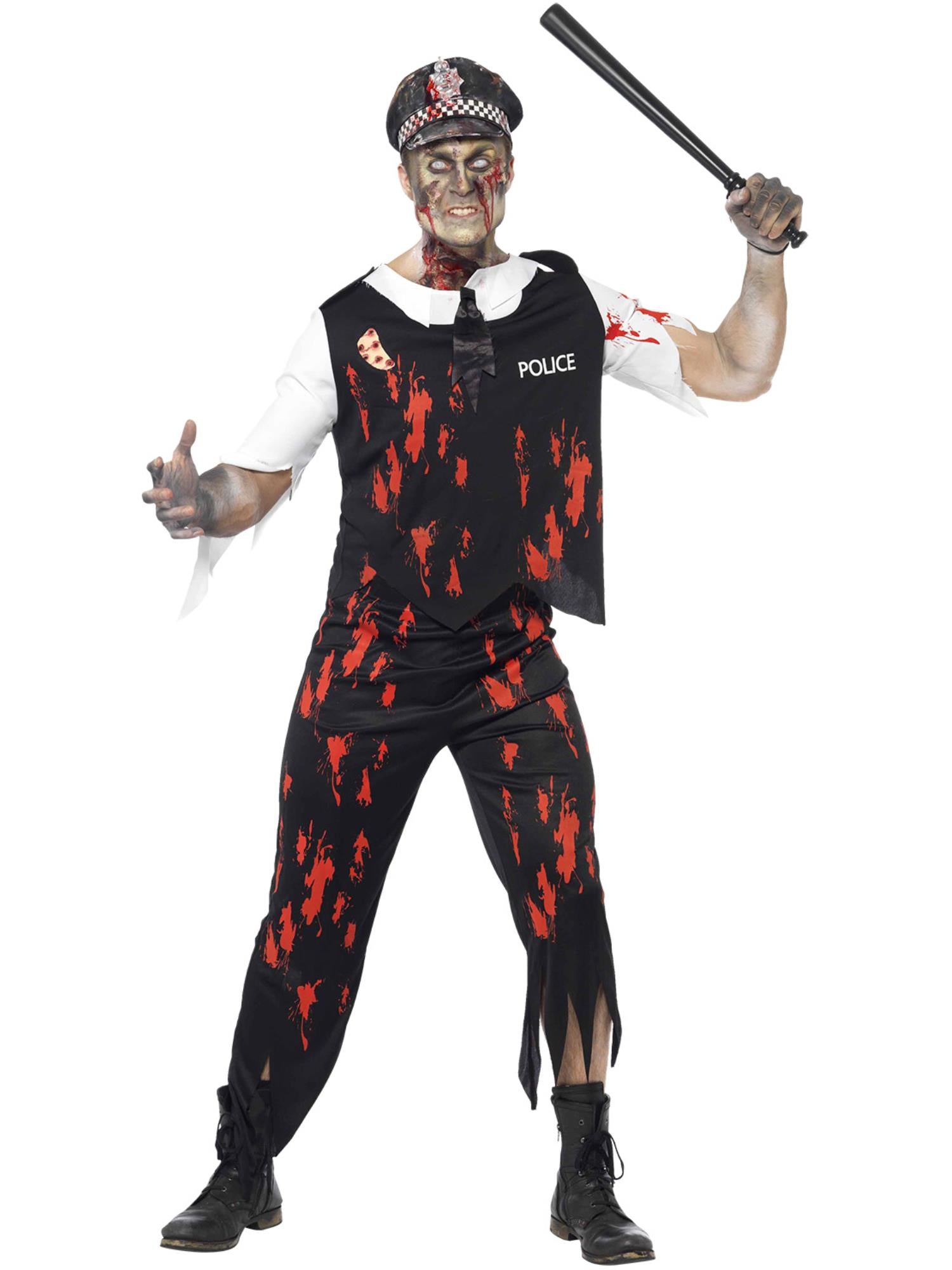 The costume includes a mock shirt front with attached vest, coordinating tie, trousers with torn-effect hems, a police-style hat, and a latex chest piece for added realistic impact. The tattered finishes and printed splatter effects enhance the zombie transformation, making it ideal for Halloween parties, themed events, and theatrical performances.
