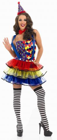 This adorable Plus Size Cutie Clown costume includes a short tutu style multi-colour dress with red and yellow baubles. Also included is a red bow tie and a pair of black and white striped stockings.